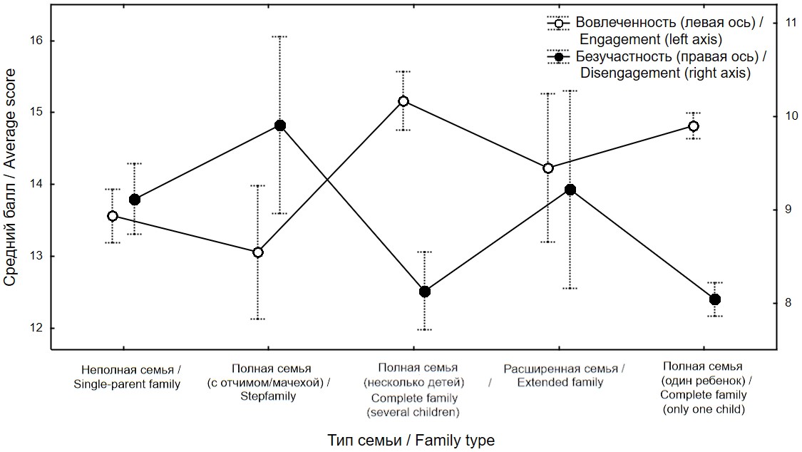 Рис. 2. Общие показатели школьной вовлеченности (левая ось) и безучастности (правая ось) у подростков из разных типов семей