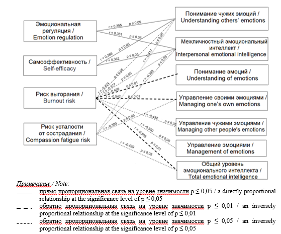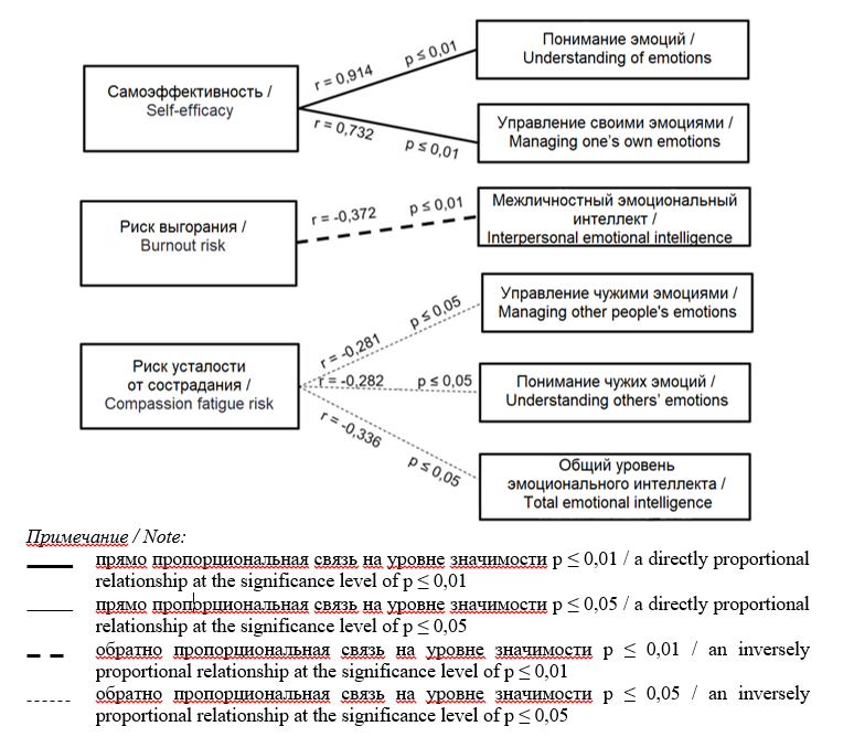 Корреляционный анализ показал, что высокая самоэффективность сотрудников ООиП сопряжена с высоким уровнем способности понимания и управления эмоциями. При высоком межличностном эмоциональном интеллекте риск выгорания у сотрудников ООиП снижается. При высоком уровне эмоционального интеллекта, а также высоком уровне понимания и управления чужими эмоциями риск усталости от сострадания у сотрудников ООиП снижается.