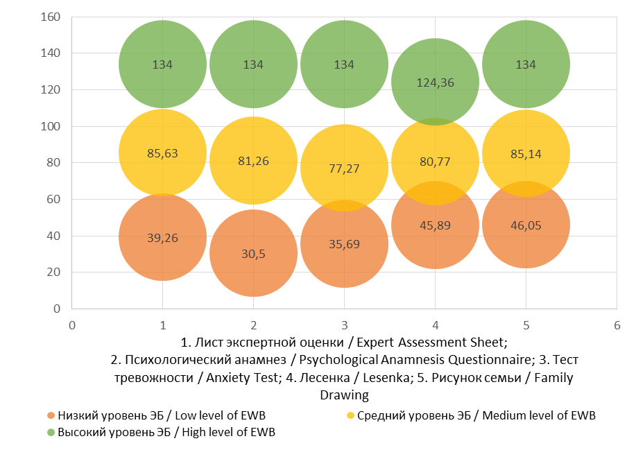 - Общие баллы суммируются по всему комплексу методик и определяется уровень ЭБ каждого ребенка. Цель статистического анализа — ранжировать детей по группам риска, для чего используется нормативное (заданное авторской моделью) деление на уровни ЭБ на основе среднего арифметического. Выделяются три уровня эмоционального благополучия: высокий, средний и низкий.