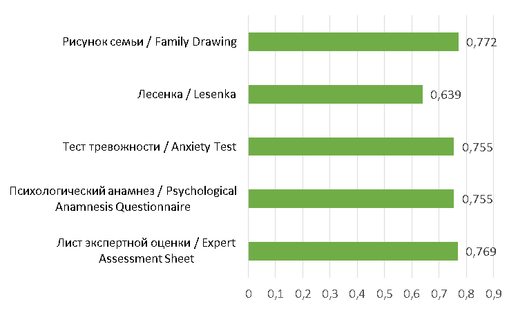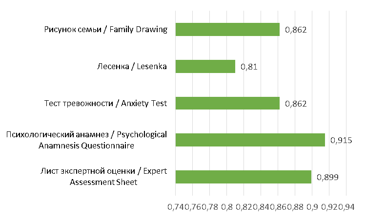 Согласно рис. 3, на уровне отдельных методик: наивысшие значения получены для анкеты «Психологический анамнез» (α = 0,915) и «Листа экспертной оценки» (α = 0,899). Наименьший показатель зафиксирован для методики «Лесенка» (α = 0,810), что остается в пределах допустимых значений («хорошая» надежность) и может объясняться малым количеством шкал в данном инструменте.