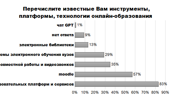 Анализ данных относительно известности инструментов, платформ и технологий онлайн-образования у наших пользователей услуг представлен на рис. 1.