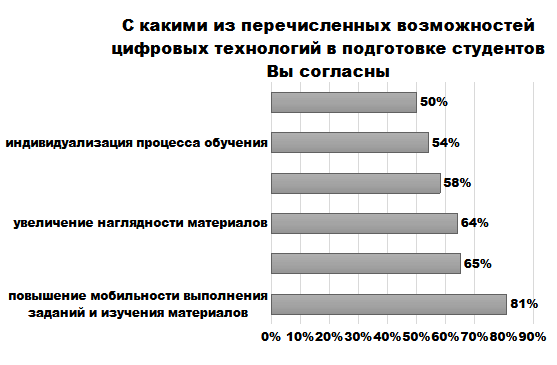 В заключительной части участникам исследования предлагалось ознакомиться с перечнем возможностей, которые предоставляют цифровые технологии в подготовке студентов, и выбрать те, с которыми они согласны. Результаты представлены на рис. 3.