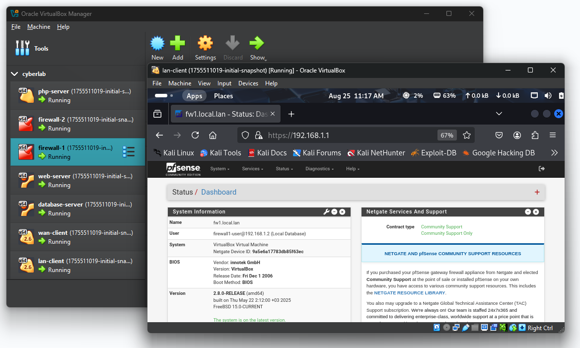 Таким образом, выбор межсетевого экрана pfSense 2.8.0-RELEASE обусловлен его высокой надежностью, производительностью и гибкостью, что идеально подходящую для экспериментов и обучения в условиях образовательного киберполигона. На рис. 2 показано успешное подключение и оптимальная работа межсетевого экрана pfSense 2.8.0-RELEASE в архитектуре образовательного киберполигона.