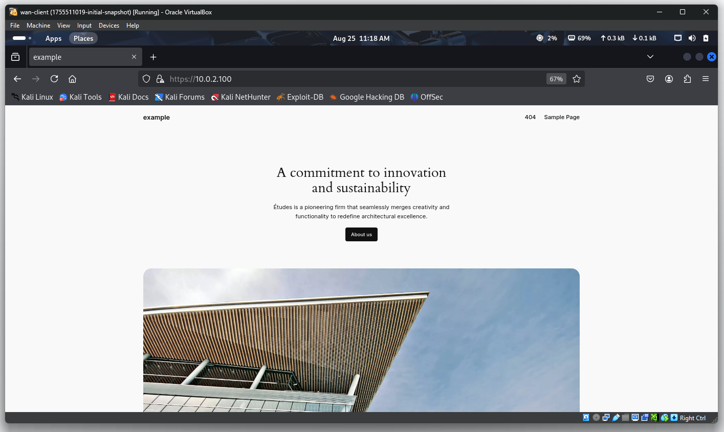 Выбранная архитектура серверов представляет собой проверенную, гибкую и масштабируемую архитектуру, способную эффективно поддерживать задачи моделирования, обучения и тестирования в рамках образовательного киберполигона. На рис. 3 показано успешное подключение клиента из сегмента WAN образовательного киберполигона к веб-серверу на базе Ubuntu Server с Wordpress в сегменте DMZ-1.