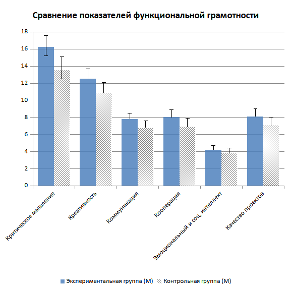 Результаты подтверждают гипотезу: грамотное применение ИИ-инструментов в проектной деятельности развивает универсальные составляющие ФГ. Инфографика по экологическим данным формирует критическое мышление (оценка данных CO₂) и креативность (дизайн решений) в экологической и информационной областях. Сценарии чат-бота усиливают коммуникацию (диалоги о расписании) и социальный интеллект (учет потребностей) в области коммуникации на родном языке. Анализ данных развивает критическое мышление и техническую грамотность в технологической области. Групповые проекты укрепляют кооперацию через согласование идей и устойчивое развитие личности через экологические ценности. Средний размер эффекта (d=0,55–0,65) указывает на значимое влияние ИИ.