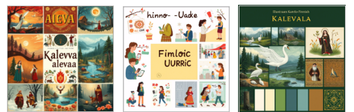 Так, в проектах, ориентированных на создание иллюстраций или видеоматериалов, в первую очередь, актуальным является использование нейросетей генерации и работы с графическим контентом: Кандинский 3.0 (https://www.sberbank.com/promo/kandinsky), Нейрохолст (https://neuro-holst.ru), Writerai (https://writerai.ru/user/dashboard), Limewire (https://limewire.com/), Leonardo AI (https://leonardo.ai/), Bing Image Creator (https://www.bing.com/create), FabulaAI (https://fabula-ai.com/tools/art-generator), Starryai (https://starryai.com/app/create). Их использование дает возможность генерации уникальных изображений этнокультурной направленности, в том числе трудно воспроизводимых вручную, ретуширования и улучшения качества существующих визуальных элементов, а также удаления дефектов на изображениях. На рис. 3 приведены примеры сгененированных изображений для иллюстрирования марийской сказки «Сереброзубая Пампалче» и карело-финского эпоса «Калевала».