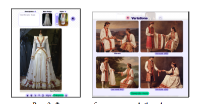 Второй этап проектной деятельности включает в себя разработку календарного плана, распределение задач и полномочий между членами проектной группы, определение показателей эффективности реализации проекта, поиск, анализ и структурирование необходимой информации. Возможности AI-дизайна (Meshy AI (www.meshy.ai); Luma AI (https://lumalabs.ai/); Masterpiece Studio (https://masterpiecestudio.com/)) на данном этапе можно использовать в части проведения работ, связанных с эскизированием и моделированием будущих изображений разрабатываемого цифрового проекта, получения креативных сочетаний элементов, которые можно в дальнейшем использовать для создания моделей национальной одежды, локаций, героев и т.д. На рис. 2 приведен фрагмент работы сервиса Artbreeder (https://www.artbreeder.com/) для генерации эскизов национальной одежды для проекта.