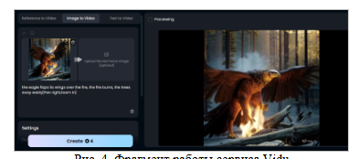 Также в ходе разработки визуальных элементов активно используются инструменты генерации видеоконтента, среди которых можно выделить Vidu (https://www.vidu.com/ru), Hailuo (https://hailuoai.video/), HeyGen (https://www.heygen.com), RunWay (https://runwayml.com/), Pika (https://pika.art/). Инструменты ИИ для генерации видео открывают огромные возможности в этнокультурных проектах — от сохранения и реконструкции традиций до создания новых художественных форм и образовательных форматов. Данные сервисы могут использоваться для генерации видеоконтента; создания анимации и моделирования объектов; улучшения качества видеоматериалов и цветокоррекции; восстановления некачественного видео. В проектах по марийскому языку и литературе это дает возможность реконструкции старинных национальных праздников, восстановления старых фотографий и хроники с помощью AI (цветокоррекция, анимация), «оживления» персонажей литературы и фольклора, создания анимаций и клипов по этническим мотивам, субтитров на разных языках малых народов. Сервисы генерации видео открывают возможности создания «национальных» цифровых аватаров, а также создания «живых» цифровых архивов народной культуры. На рис. 4 приведен фрагмент работы сервиса Vidu.