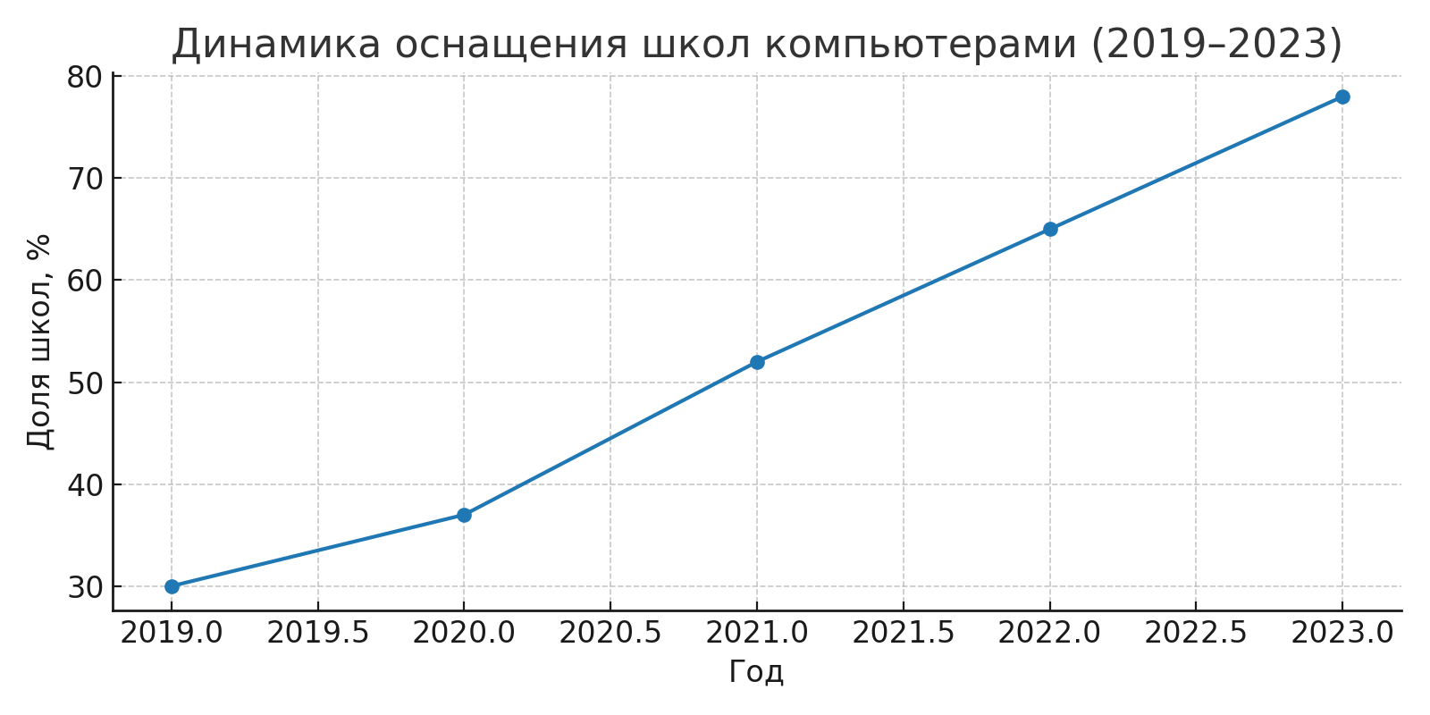 1. Недостаточная оснащенность школ ИКТ-оборудованием. До пандемии многие японские школы не были готовы к переходу на дистанционное обучение. Согласно исследованию Министерства образования, культуры, спорта, науки и технологий Японии, в 2020 году лишь 37% школ имели достаточное количество компьютеров для всех учащихся, а скорость интернета в сельских районах оставалась низкой (Министерство образования …, 2023, с. 12). Это создало серьезные препятствия для организации онлайн-уроков. Рис. 1 показывает резкий рост с 37% в 2020 до 52% в 2021 и 78% в 2023 году.