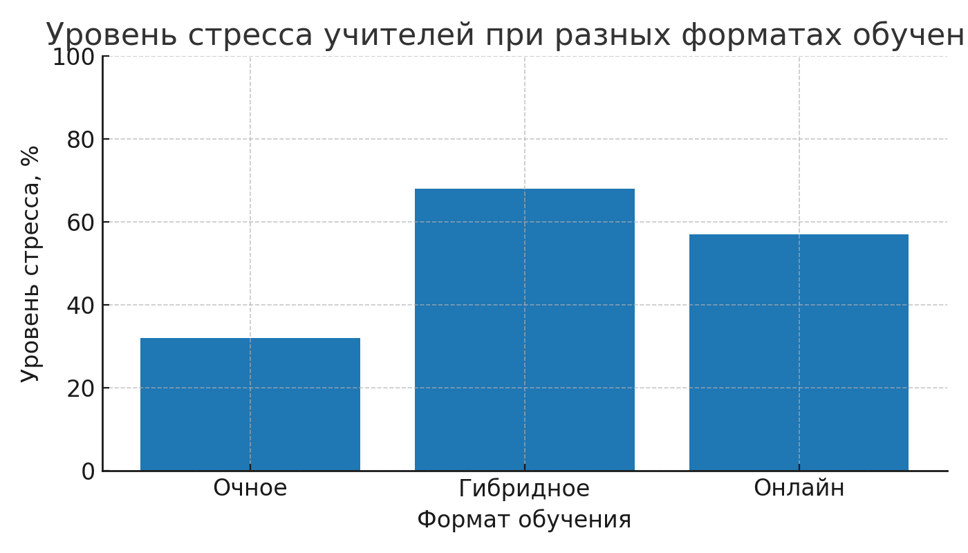 3. Перегрузка учителей и низкая цифровая грамотность. Исследование, проведенное Atlantis Press, показало, что 68% учителей испытывали стресс из-за необходимости совмещать очное и онлайн-обучение, при этом многие не имели достаточной подготовки для работы с цифровыми платформами регионах. На рис. 2 можно увидеть сравнение стресса японских учителей при очном (32%), гибридном (68%) и полностью онлайн (57%) обучении.