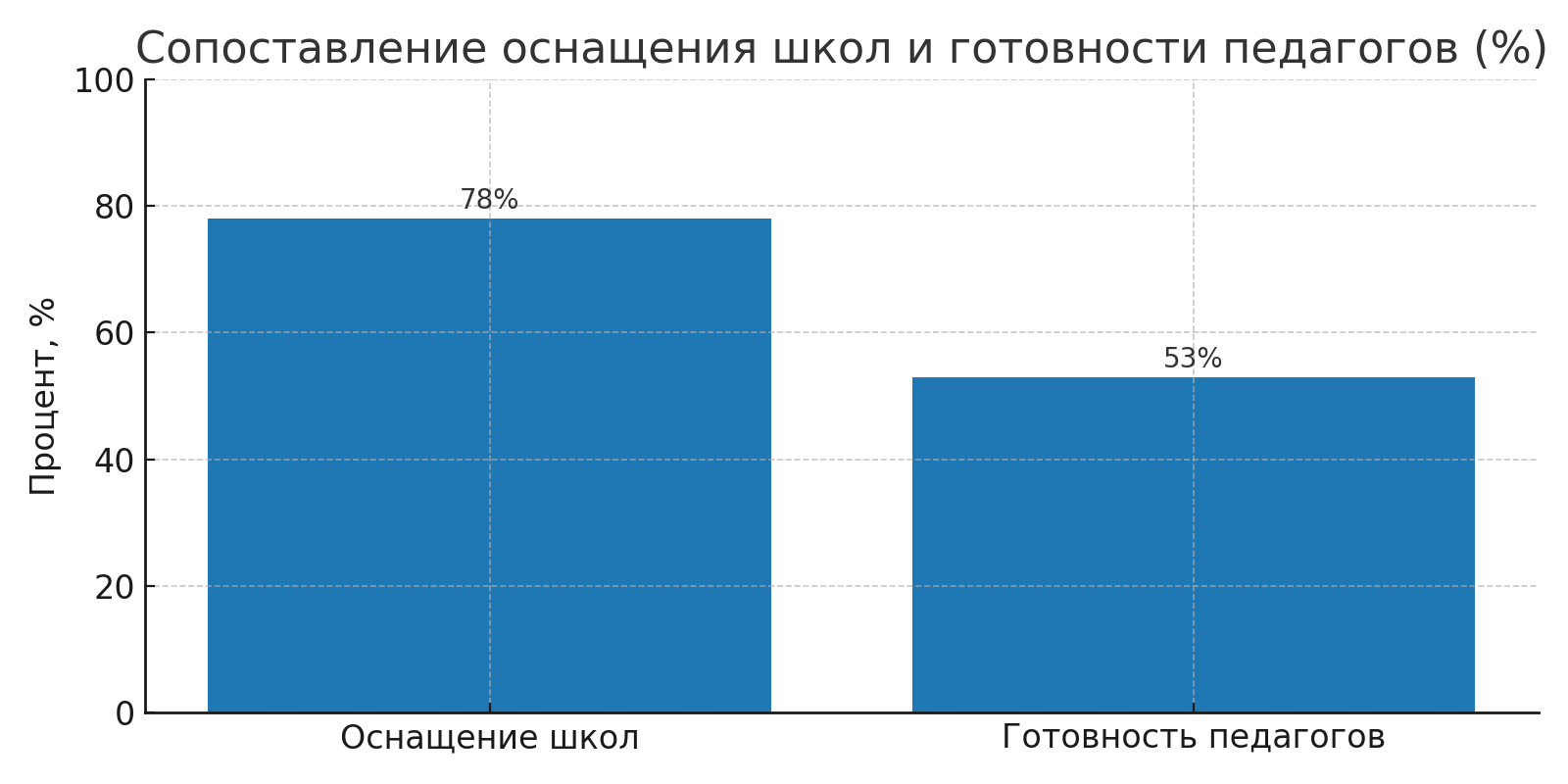 Основная проблема (см. рис. 3) заключается в диспропорции между техническим оснащением (78% школ) и готовностью педагогов (53%). «Цифровизация образования требует системного подхода, где инфраструктура и кадры развиваются синхронно», – подчеркивается в отчете ОЭСР [Университет Токио …, 2023, с. 89].