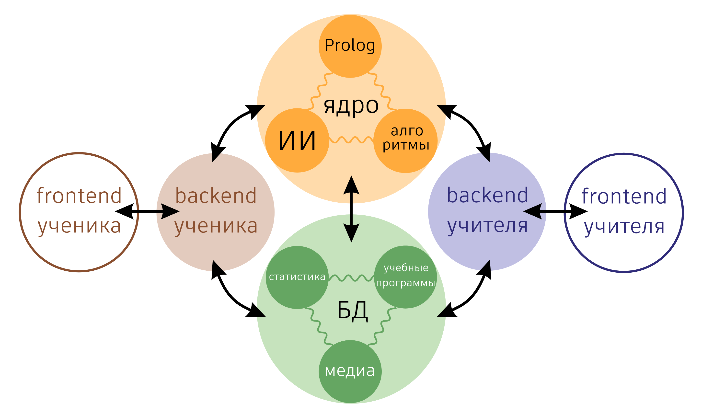 Со связкой «ядро-БД» взаимодействуют сразу две отдельные подсистемы обеспечения онлайн-доступа: для учителя и для ученика. (см. рис. 4) Обе подсистемы отвечают за корректное функционирование веб-страниц, через которые осуществляется доступ пользователей к системе, в том числе задачи входа/логина, корректного функционирования страниц доступа и работы с учебными материалами. Python-скрипты, которые ученик пишет вместе с ИИ-тьютором, полностью выполняются в «песочнице» на стороне frontend ученика, то есть в его браузере на его компьютере – это исключает возможность вмешательства в работу системы с помощью кода Python.