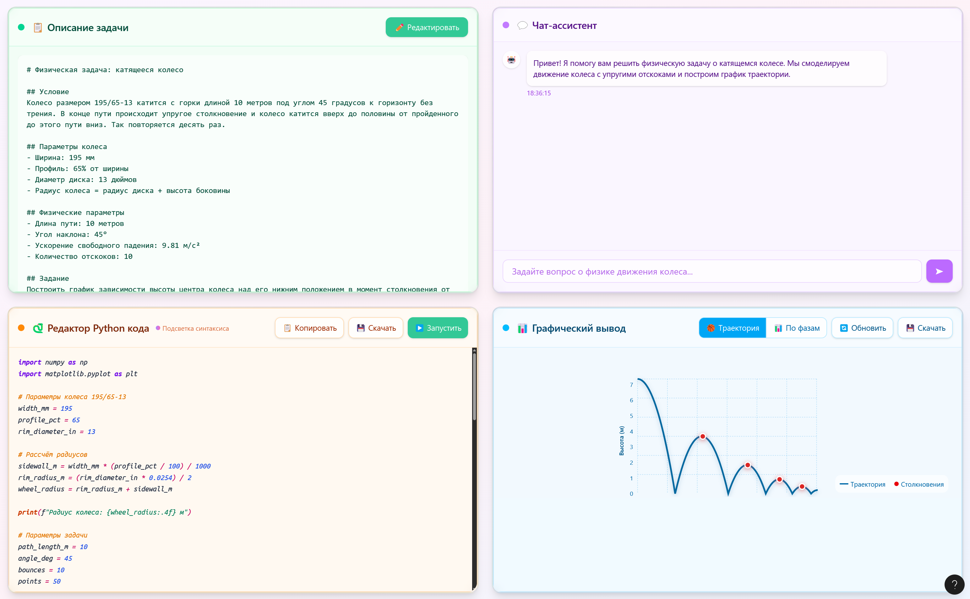 Ученик взаимодействует с ИИ-тьютором на каждом этапе: спрашивает формулу или пояснение по физике («Напомни формулу перемещения при равноускоренном движении»), получает подсказку для решения уравнения («Как решить квадратное уравнение 2t² + 5t – 100 = 0?»), и запрашивает помощь с кодом («Приведи пример кода на Python для построения графиков s(t) и v(t)»). ИИ-тьютор реагирует соответствующим образом – напоминает или выводит формулу s(t) = s0 + v0*t + 0.5*a*t^2 и объясняет смысл каждого члена, описывает шаги решения квадратного уравнения (при необходимости предоставляя решение по формуле корней), а также генерирует снабженный комментариями фрагмент кода Python для построения требуемого графика. Ученик использует эти подсказки, чтобы выполнить каждую часть задания. В завершение система проверяет численные ответы ученика и даже анализирует результаты работы Python-кода с помощью логического модуля (например, сравнивая несколько выборочных значений вывода программы ученика с ожидаемыми теоретическими значениями).