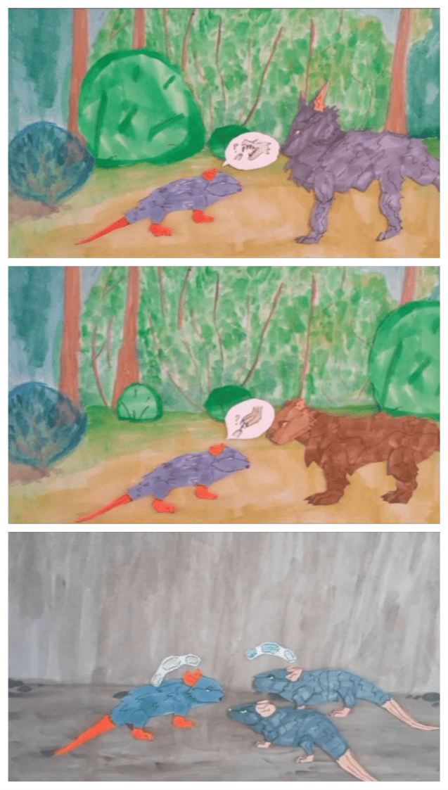 Иная ситуация возникла в ЭГ2, где изначально были четыре маргинальных подростка, не только неуважительно и агрессивно относящихся к сверстникам, но игнорирующие и временами демонстрирующие пренебрежение к педагогам. Они саботировали свое участие в театральном проекте, пытались негативно влиять на участие окружающих в проекте. Именно в этой группе находились два подростка группы риска – девочка В., пережившая смерть сиблинга, и девочка Анж., воспитываемая бабушкой ввиду лишения родителей родительских прав. До начала проекта педагогов встревожило состояние девочки В. из ЭГ2, которая нарисовала на уроке ИЗО соответствующий плакат с призывом остановить травлю (рис.1). на первом занятии проекта она попробовала себя в экспериментировании с ролями, проигрывании этюдов с другими подростками, но из-за чувства крайней некомфортности отказалась от такого рода деятельности. Позже объединилась с Анж., которая никогда ни с кем не общалась из класса, для написания сценария спектакля и создания мультфильма. Интересно, что сюжет, придуманный девочками для мультфильма, также имел отношение к травле – крыса подговаривает больших и сильных животных на агрессивные действия против выбранной жертвы (рис. 2).