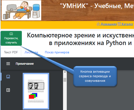 Если открыть любую интерактивную книгу, то откроется ее оглавление, текст, загруженный из PDF файла и кнопка для активации сервиса перевода и озвучивания (рис.3).