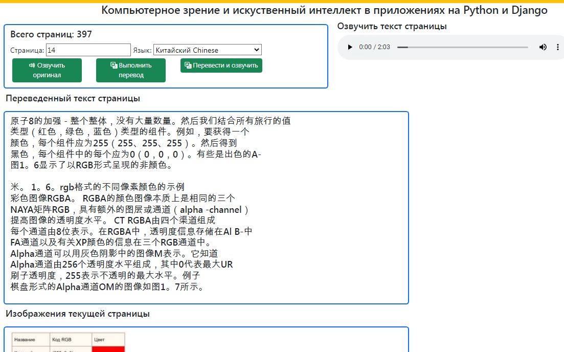 Например, учащийся выбрал 14-ю страницу книги, китайский язык и нажал на кнопку «Перевести и озвучить». После этого на данной вкладке появится страница с текстом, переведенным на китайский язык и аудио проигрыватель (рис. 5).