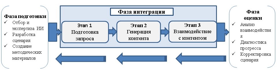 Данная модель интеграции технологий генеративного ИИ циклична, поскольку предполагает, что оценка результатов интеграции влияет на фазу подготовки нового цикла интеграции ИИ в образовательный процесс.