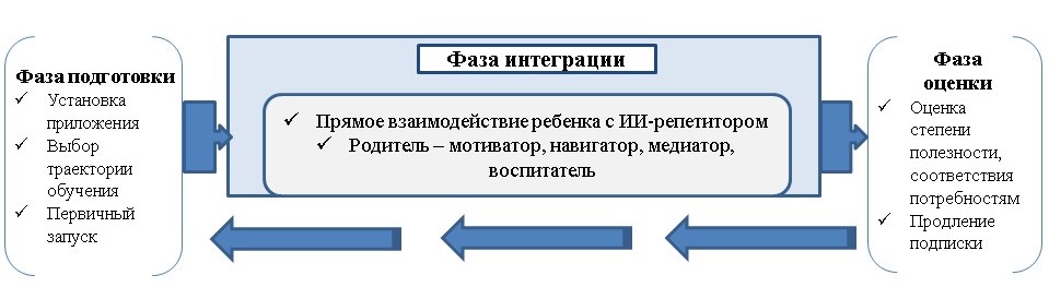 На предварительном этапе опытно-экспериментального исследования было выявлено, что при разработке сценариев интеграции ИИ-технологий в образовательный процесс в государственных и частных образовательных организациях, важно учесть, во-первых, факт обучения в групповом формате, во-вторых, наличие существенных ограничений по доступу к оборудованию с подключением к сети Интернет, в-третьих, необходимость соблюдения требований образовательных программ, утвержденных в организации. Учет данных условий обусловил выбор ряда технологий, а именно, технологий генеративного искусственного интеллекта, позволяющего создавать любой контент в соответствии с запросом. Анализ данных показал, что процесс интеграции ИИ-технологий в контексте дошкольной образовательной организации имеет три фазы (см. рис.1).